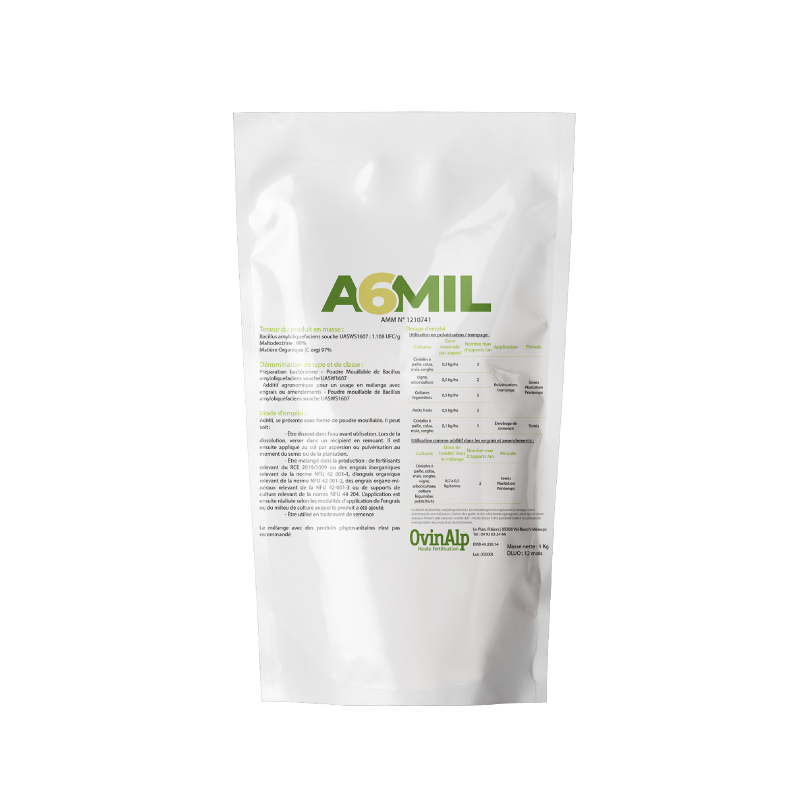 A6MIL est composé de Bacillus amyloliquefaciens (1×10⁹ UFC/g, souche UASWS1607) stabilisé par de la maltodextrine. Ce micro-organisme améliore la solubilisation du phosphore, qu’il soit organique (Po) ou inorganique (Pi), rendant cet élément nutritif directement assimilable par les plants.